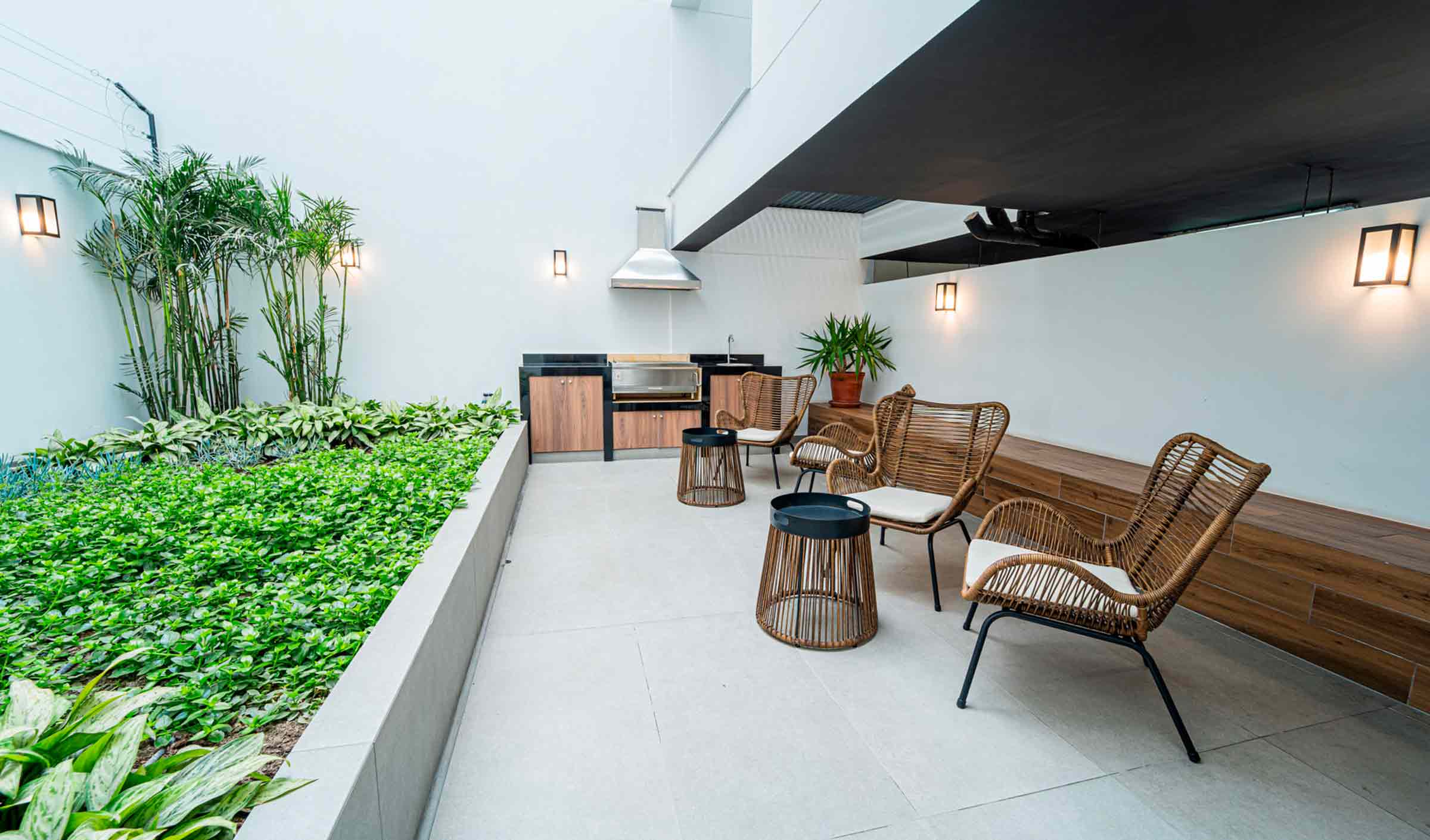 El proyecto tiene una pérgola en el frontis del proyecto, elegante hall de ingreso, gimnasio, jardín interno con parrilla, estacionamiento para bicicletas.