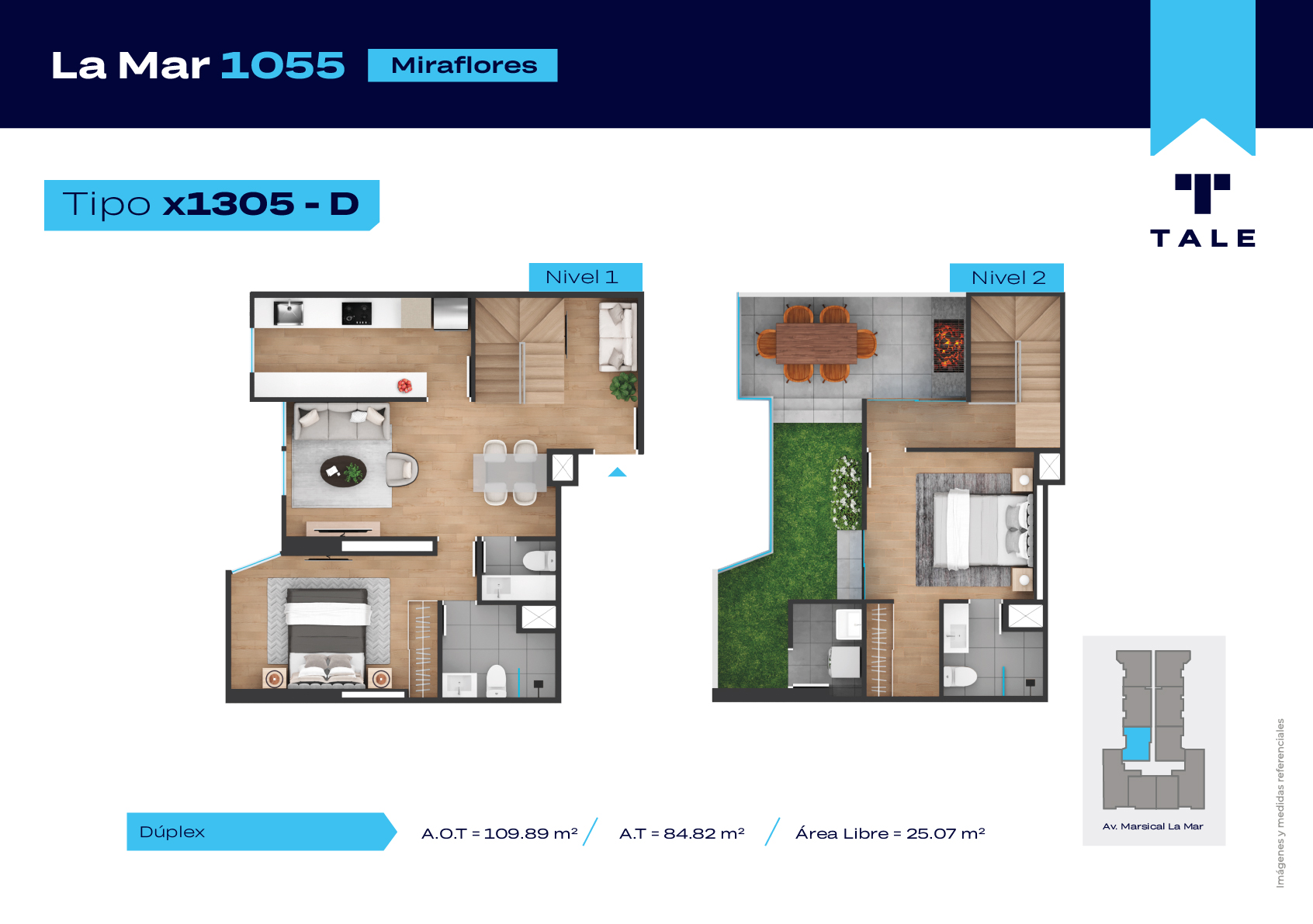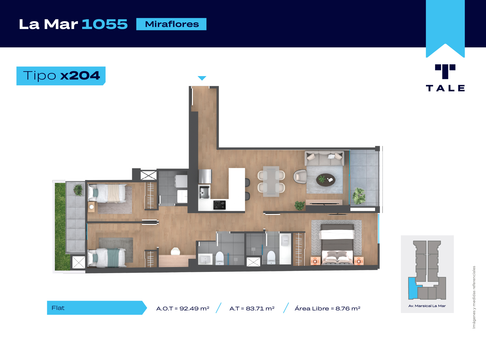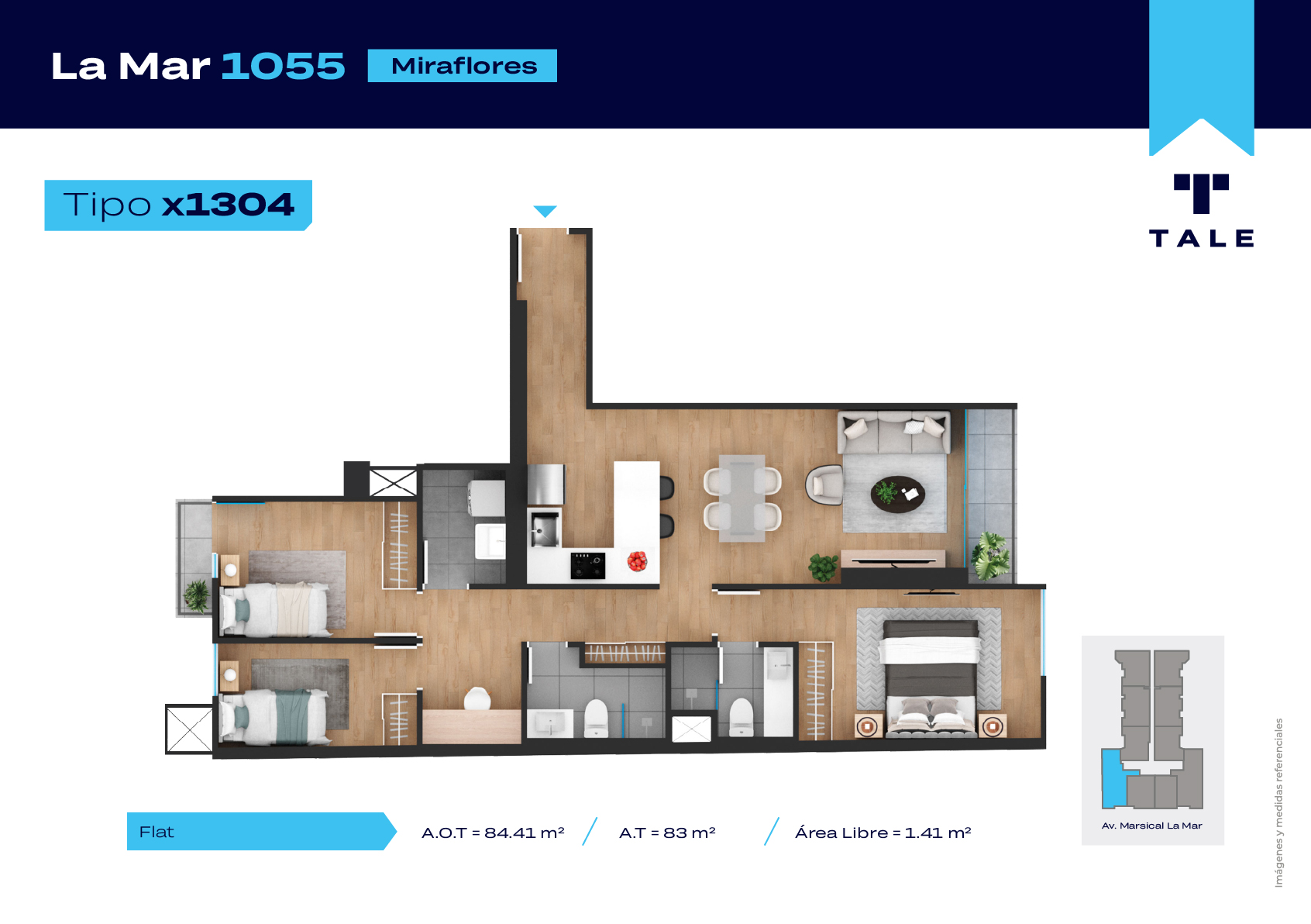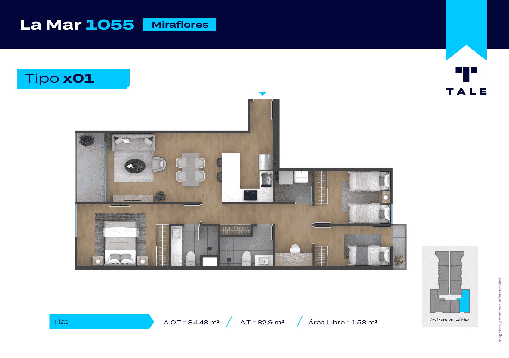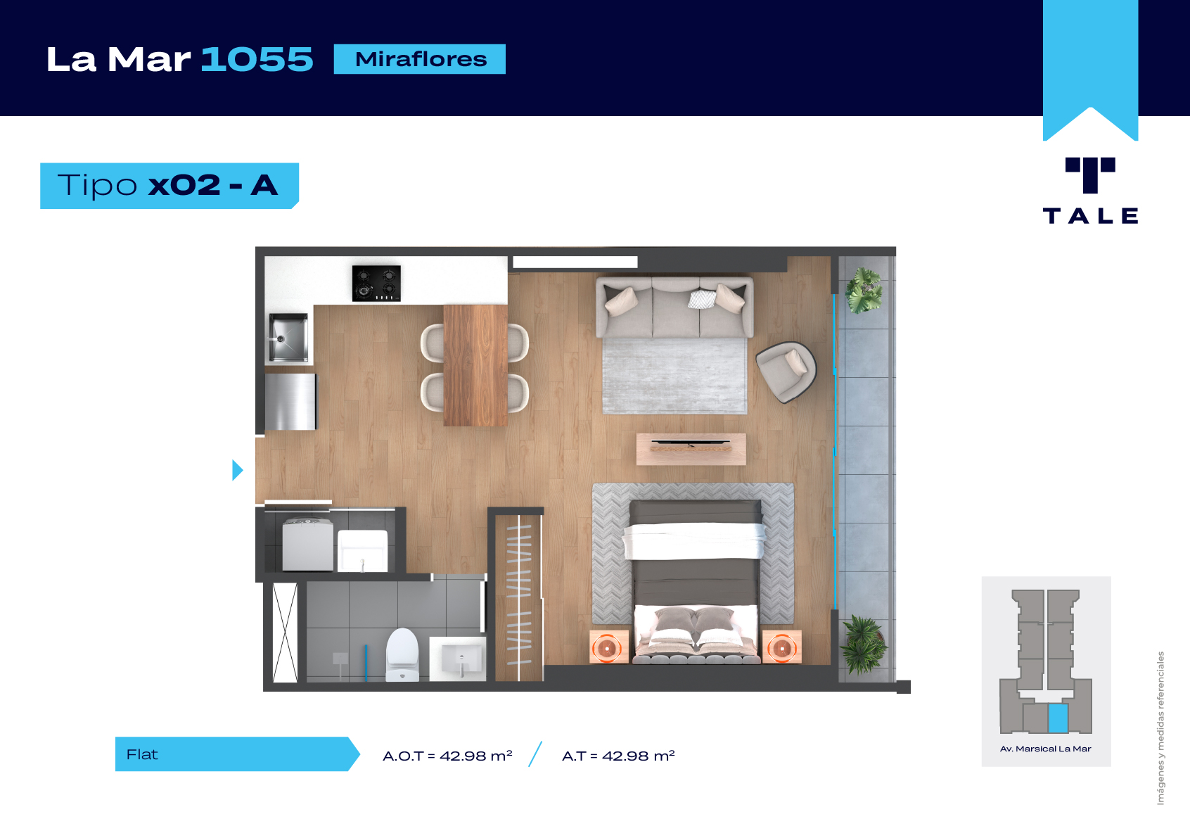 La Mar es una residencial de 13 pisos, a 3 cuadras y media del malecón y dentro del Hub Gastronomico de Miraflores. El proyecto cuenta con Lobby, Estacionamiento de bicicleta, Piscina, Terraza, Área de Parrillas, Sala de Jovenes y Gimnasio.